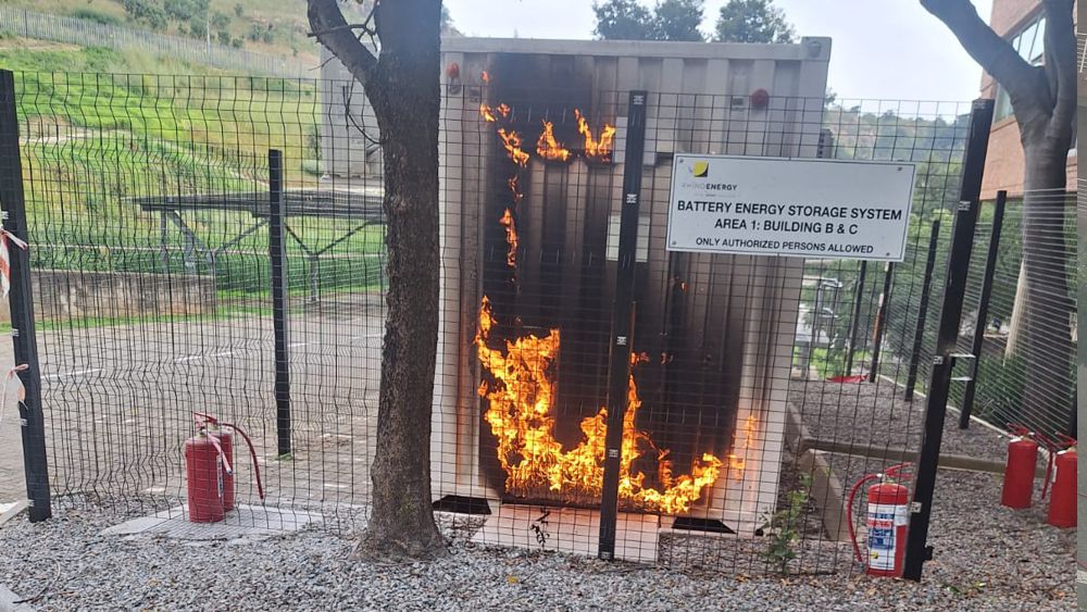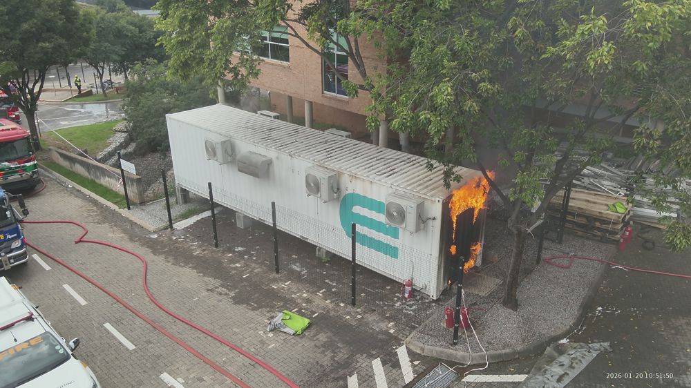 leading private fire and rescue service, was alerted of the incident by a Standard Bank staff at 09h18. The fire originated from Lithium-Ion batteries fitted inside a container, linked to a solar energy installation on site.