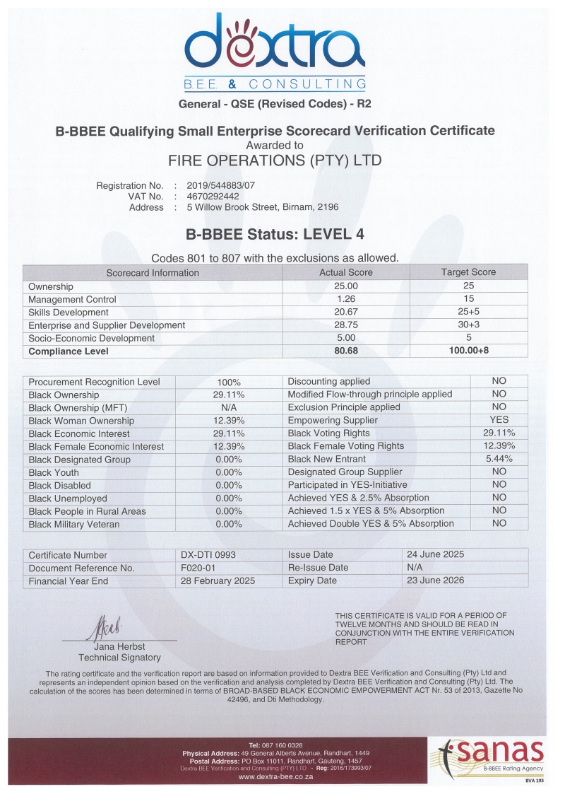 FIRE OPS SA supports the BROAD-BASED BLACK ECONOMIC EMPOWERMENT ACT and proudly holds B-BBEE certification.