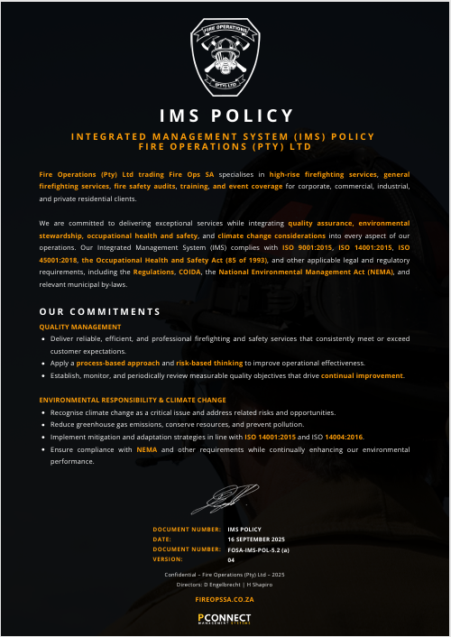 Through the Integrated Management System (IMS), FIRE OPS SA is committed to delivering top-tier fire and emergency services while upholding the highest standards in quality, environmental responsibility, and safety aligning with ISO 9001:2015, ISO 14001:2015, ISO 45001:2018, and the Occupational Health and Safety Act (No. 85 of 1993).