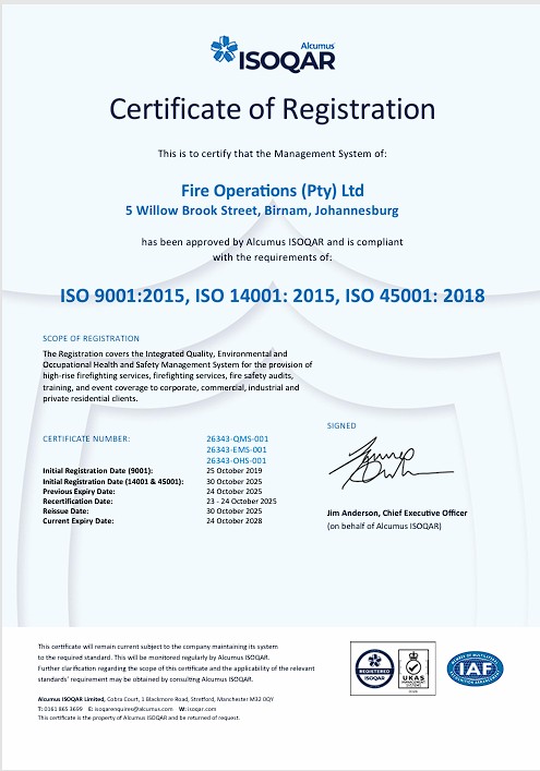 Through the Integrated Management System (IMS), FIRE OPS SA is committed to delivering top-tier fire and emergency services while upholding the highest standards in quality, environmental responsibility, and safety aligning with ISO 9001:2015, ISO 14001:2015, ISO 45001:2018, and the Occupational Health and Safety Act (No. 85 of 1993).